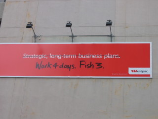 Ich fragte telefonisch bei meiner Bank nach, ob es moeglich waere die Karte von Deutschland aus zu entsperren; keine Chance. So ueberlegte ich schon hin und her, wie ich eine neue Karte auf dem sichersten Weg nach Neuseeland bekomme. Da brachte mich Suzie auf die Idee, doch einfach in Neuseeland ein Konto zu eroeffnen. Leichter gesagt als getan, dachte ich so bei mir. Doch wieder einmal wurde ich von der Unkompliziertheit der Neuseelaender ueberrascht. Ich ging zur Westpac (ich weiss, das ist Werbung, aber das haben die sich hier mal verdient) und fragte dort nach einem Konto bzw. einer Karte zum Geld abheben. Und, was soll ich sagen, es dauerte gerade mal 10 Minuten(!), bis ich stolzer Besitzer eines Westpac-Kontos incl. Karte und PIN war. Bei welcher Bank/Sparkasse in Deutschland waere das moeglich gewesen? Jetzt musste ich nur noch Geld online von Deutschland auf mein neues Konto in Neuseeland ueberweisen. Innerhalb von zwei Tagen war ich wieder fluessig. Die Westpac hat mich insoweit ueberzeugt. Vielleicht gefaellt mir aber auch nur die Einstellung, der Westpac, die man hier auf Werbetafeln lesen kann: "Work 4 days. Fish 3." ;) ;) ;) (siehe Bild)